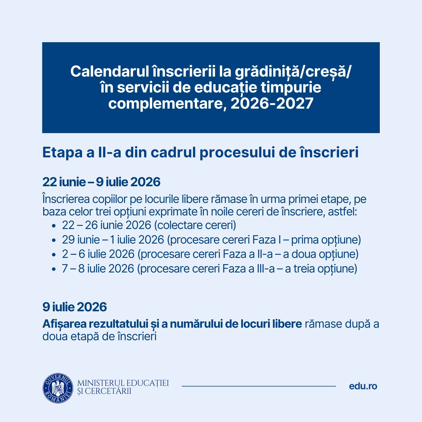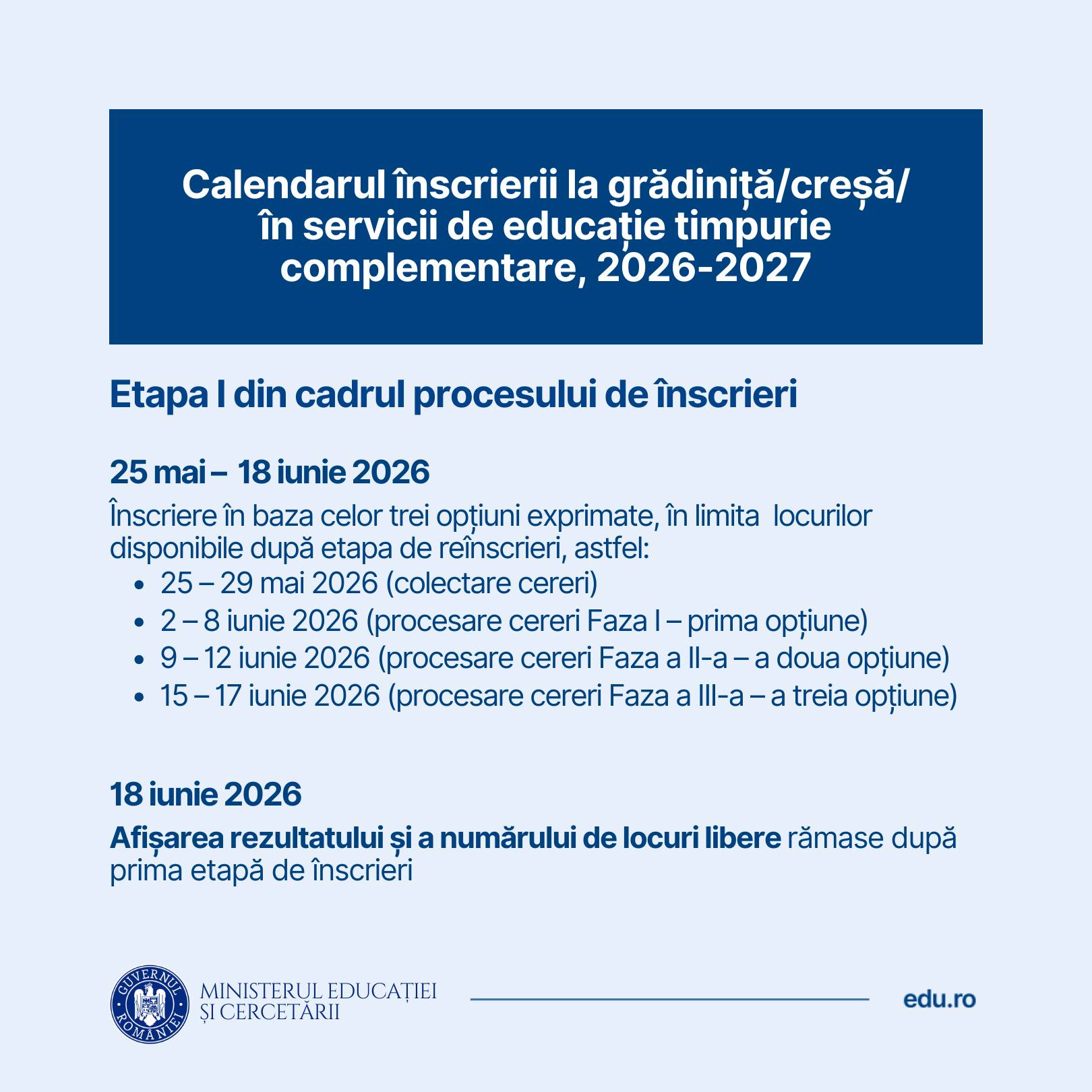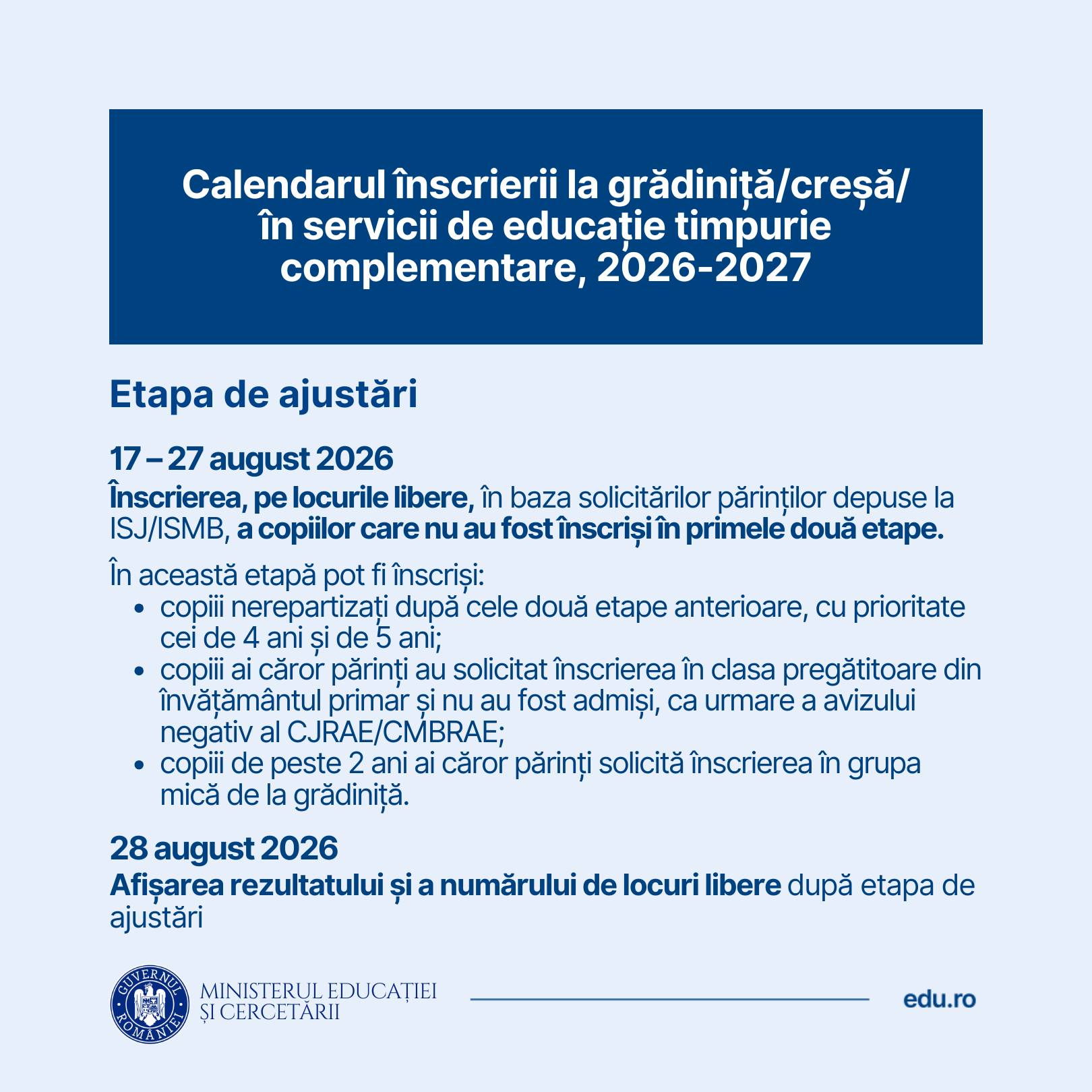 Informații privind calendarul și procesul de înscriere/reînscriere în învățământul preșcolar în anul școlar 2026-2027